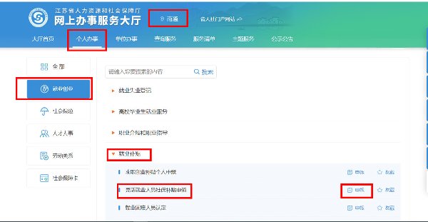 1.登陆江苏省人社网上办事服务大厅(点击进入),选择“南通”市,依次点击“个人办事”—“就业创业”—“就业补贴”—“灵活就业人员社保补贴申领”—“申报”。