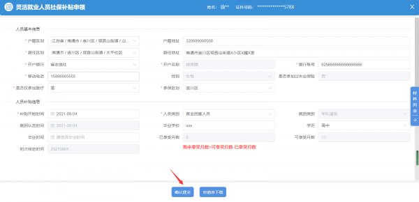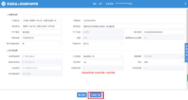 2. 完善“人员基本信息”和“人员补贴信息”,“户籍区划”及“居住区划”要到具体的社区(村);下载并按要求填写“灵活就业人员社会保险补贴申请表”。